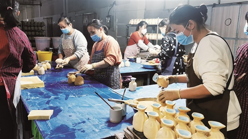 保靖县金锋陶瓷有限责任公司生产车间里,工人正在对酒瓶上釉。 李寒露 摄