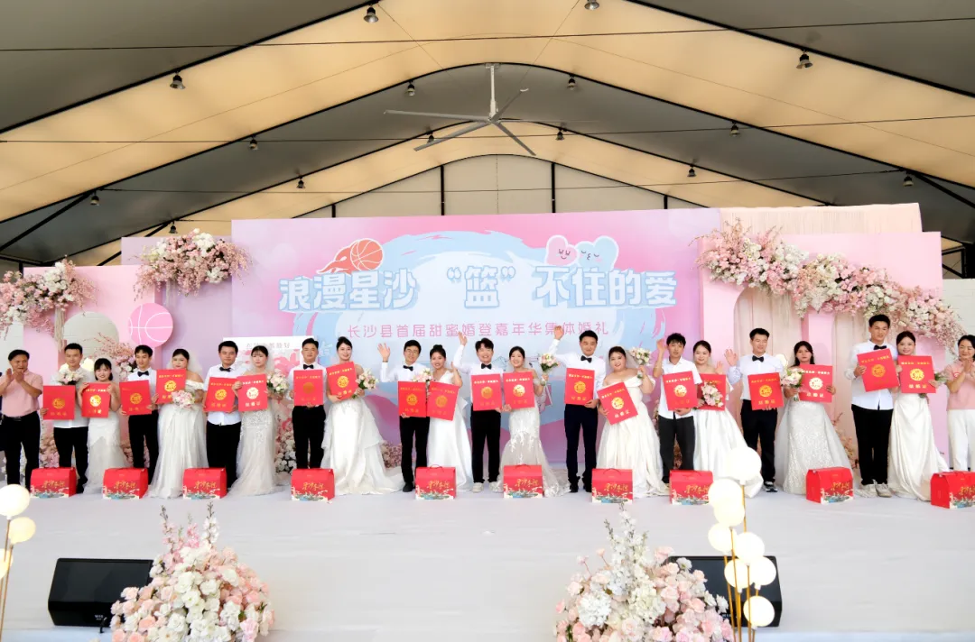2025年8月29日,由长沙县民政局策划发起的“浪漫星沙·‘篮’不住的爱”首届甜蜜婚登嘉年华集体婚礼在长沙县婚姻登记服务中心举行,10对新人用一场简约而不失庄重的仪式,践行文明婚俗新风尚,长沙市文明家庭、金婚夫妻陈小明、吴秋燕夫妇带领新人们宣读结婚誓词,现场还为新人们发放了《移风易俗倡议书》等宣传页,有效倡导了崇尚文明新风,喜事新办、婚事简办理念。