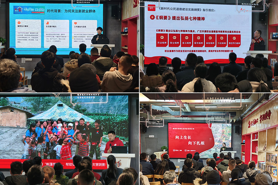 宣讲活动环节中,四位来自不同领域的宣讲人用亲身经历诠释新时代奋斗者的担当。“中国好人”傅强以《新时代 新阶层 新作为》为题,分享了26年深耕公益一线的坚守,展现了新的社会阶层人士的责任与格局;党的二十大代表、快递小哥马石光带来《匠心之路,铸就新时代物流人》,22年风雨无阻,用匠心对待每一个包裹,诉说平凡岗位的不凡价值;“新农人”龙燕以《向上生长 向下扎根》为题,讲述了他放弃城市生活扎根乡村,用科技赋能农业的追梦故事;社区书记石希分享《“四个友好”筑港湾 思政情暖“新”家人》,23年扎根基层的她,用“四个友好”理念为新就业群体搭建温暖港湾,让“异乡人”变身“家里人”。