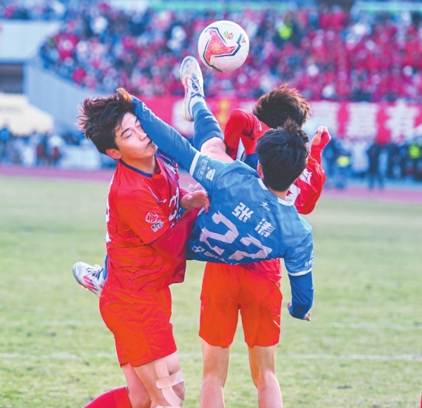 2025年12月27日晚,永州队球员谷文杰头球破门瞬间。当晚,永州队(蓝)以1比0战胜常德队,获得2025湘超联赛冠军。