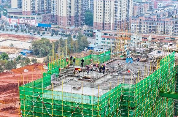 新田县云裕公园华庭一期安居工程工地塔吊林立、机械轰鸣,工人们正加紧施工。刘贵雄摄