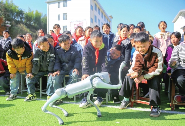 2025年11月27日,隆回县虎形山瑶族乡九年义务制学校,孩子们与机器狗互动,城乡教育均衡发展照进现实。曾勇陈勇摄