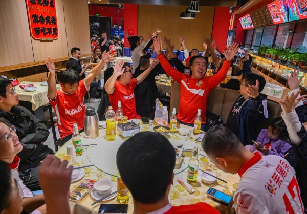 株洲市某烧烤店,球迷们观看比赛后在狂欢庆祝。“湘超”带火了当地餐饮、文旅等消费经济。郭立亮摄