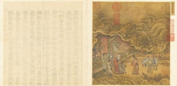 元朱玉《龙宫水府图》45.6厘米x43.3厘米绢本设色取材于唐人小说“柳毅传书”的情节,为龙王率众侍从出门迎请柳毅的画面。