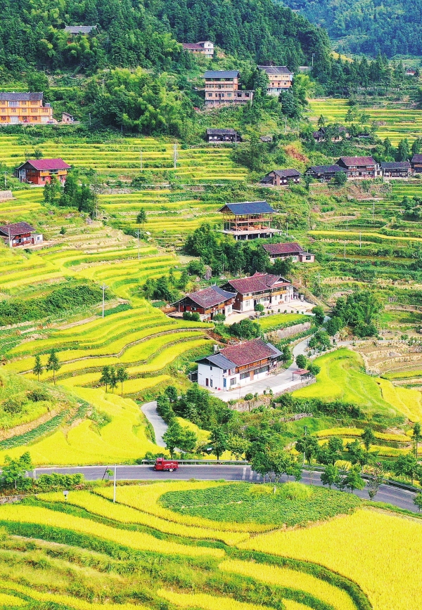 新化县水车镇紫鹊界梯田尽染金黄,与山林、村落相映成趣。黄春涛摄