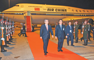 当地时间10月9日晚,李强乘包机抵达万象瓦岱机场。老挝计划投资部长、老中合作委员会主席佩和中国驻老挝大使方虹等到机场迎接。