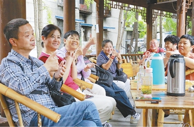因附近不少居民喜欢遛鸟,西南街社区借鉴邻里会客厅的建设经验,将另一小块空地因地制宜加以改造,平整了地面,修建了木亭长廊,起名“杏园”。养鸟爱好者们坐在园子里、长廊下,喝茶、打牌、交流经验。“早上来,晚上走,能耍一天。”居民钟先华笑言,在这里生活,幸福得很。