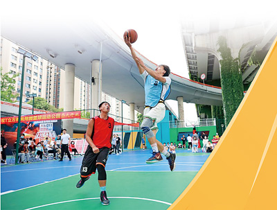 居民在改造后的成都双桥子立交桥下篮球公园运动。