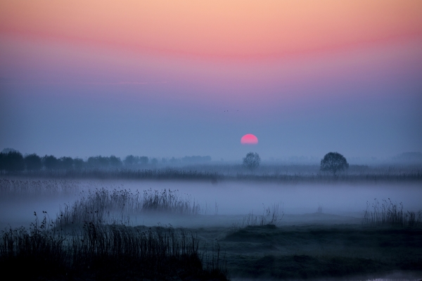 清晨,南洞庭湖晨雾缭绕,太阳逐渐升起。