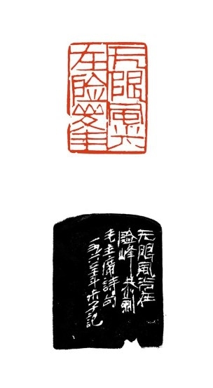 此次西泠印社藏品展,实际上是湖南籍西泠印社社员及其朋友圈名家的作品集结。这些作品的作者都和湖南或湖南印人有着千丝万缕的联系。如吴昌硕的对联作品“天惊地怪见落笔,巷语街谈总入诗”其上款:“秉三仁兄属书,集元遗山句应之,时壬戌之秋七月既望。”这是吴昌硕1922年秋写给湘人熊希龄的。而张宗祥的书法作品,内容是湘人毛泽东主席的词作。傅抱石的画作《不到长城非好汉图》是诠释毛主席的词意。罗尗子的篆刻“无限风光在险峰”也出自毛主席的诗句,其刚健的印风和印面线条如屋漏痕般浑厚苍茫,也是湖湘人“霸得蛮”性格的艺术投射。还有敖普安的篆刻“潇湘夜雨”、陈松长的书法“潇湘八景诗”,无不与湖湘关联。
