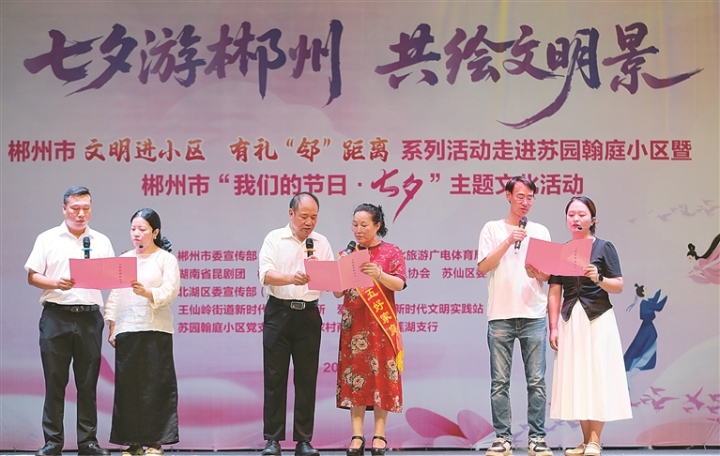 8月29日,第二站“七夕游郴州 有爱共文明”主题活动走进苏仙区苏园翰庭小区。活动中,三组文明家庭发出移风易俗倡议。