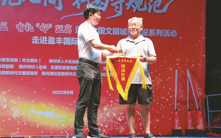 当盈丰国际小区党支部书记黄永雄将旗帜交到苏仙区王仙岭街道苏园翰庭小区党支部书记曹三明手中时,这面旗帜的传递,象征着文明接力棒的延续,更是一种“我们小区也能办好”的公开承诺,激励着每个小区都成为文明创建的主角。它鼓励居民从旁观者变为参与者,甚至主导者,将陌邻转化为睦邻,从而接力推广文明治理模式。