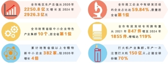 5年来,作为全国老工业基地,邵阳大力实施产业兴邵、科技强邵、开放活邵。全市累计培育省级产业集群12个,数量居全省第二位。其中,省级中小企业特色产业集群10个,数量居全省第一位。打火机产业成功入选国家级中小企业特色产业集群,年产一次注塑打火机150亿只,占据全球70%的市场份额。特色轻工产业规模突破1000亿元,形成“集群带动产业、产业支撑发展”的良好格局。