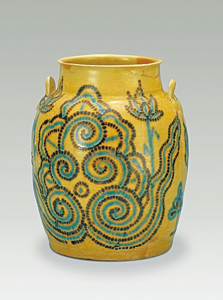 扬州博物馆藏长沙窑青釉褐绿点彩云荷纹双耳罐,1974年扬州唐城遗址出土。资料图