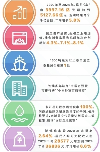 湖南日报10月21日讯(全媒体记者姜鸿丽周磊)今天,湖南省“‘十四五’答卷”系列主题新闻发布会岳阳专场在长沙举行。2020年至2024年,岳阳GDP由3997.16亿元增加到5127.66亿元,连续跨越4000亿元和5000亿元台阶,年均增长5.8%;人均GDP由7.9万元提升到10.3万元,年均增长6.2%。岳阳连续多年跻身“中国百强城市排行榜”。