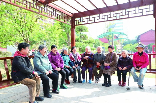 人民路社区居民在公园亭子下聊天。张佳伟摄