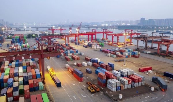 暮色下的长沙新港码头一片繁忙景象。辜鹏博摄