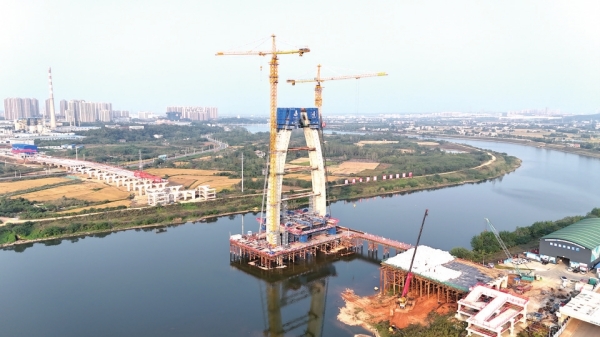 如同人之生长要先强筋骨,城市生长也要先拉伸交通骨架,拓展城区空间。宁乡市委市政府根据“一年打基础、三年见成效、五年初成型”的时序目标,着力构建“两长两纵两横两路”综合交通网。目前,滨江路、沿河北路、华强北延线、玉潭东路、沩东大道等“两纵两横”竣工通车。作为综合交通网重要组成部分的发展大桥,不仅是东城组团与宁乡经开区联系的交通要冲,更是城区东南部的重要城市主干路。大桥现正在进行主塔施工,预计2027年1月完工后,这道横跨沩水的“长虹”将成为城市新地标。