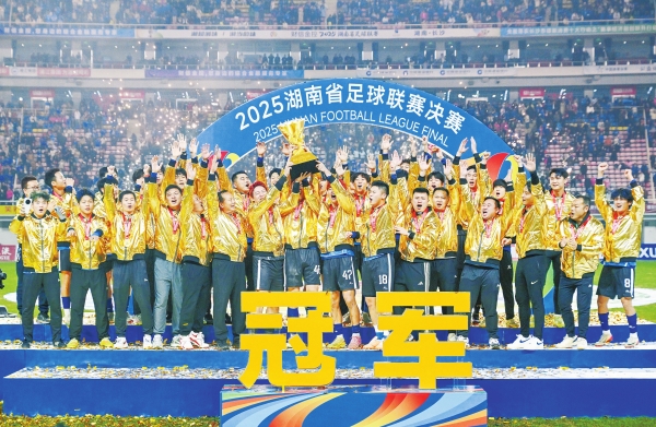 湖南日报12月27日讯(全媒体记者孙敏坚蔡矜宜)27日晚,2025湖南省足球联赛(以下简称“湘超联赛”)在长沙贺龙体育场上演巅峰对决。经过90分钟的鏖战,最终永州队以1∶0战胜常德队,夺得2025湘超联赛冠军。全国政协副主席、民革中央常务副主席何报翔到场观赛,省委副书记、省长毛伟明为冠军球队颁奖。