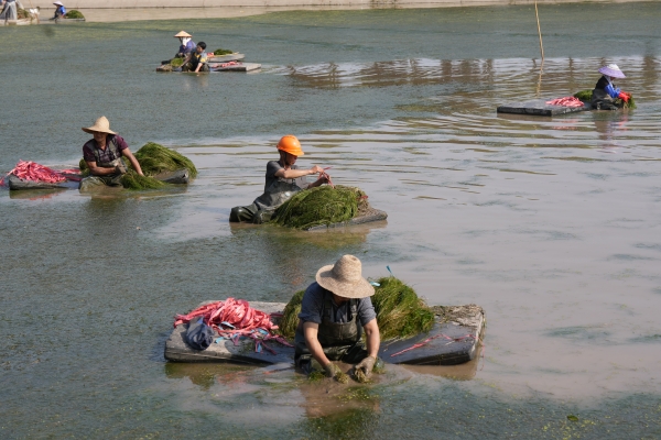 工人在大通湖水生植物产业示范园内采收水草。刘钊作摄