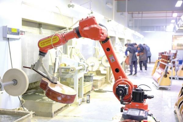 3月19日,东安县吉他产业园内智能机械臂为制作好的吉他抛光打磨。严洁摄