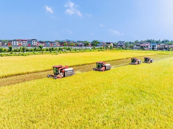 7月19日,东安县芦洪市镇西江桥村高标准农田里,农民驾驶农机抢收早稻。蔡小平摄