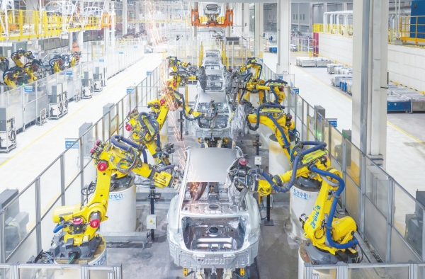 3月13日,长沙比亚迪雨花基地焊装工厂,智能化生产线上的机械臂伸缩旋转,有条不紊地完成焊接工作。湖南日报全媒体记者辜鹏博摄