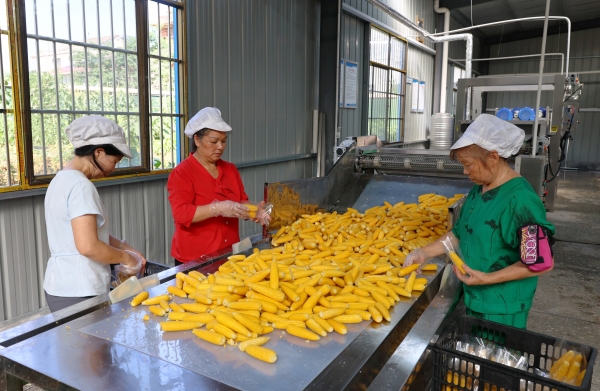 岳家桥镇“伢子”小玉米生产车间,村民正在打包。