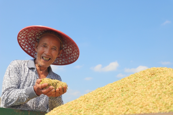村民捧出一抔稻谷,脸上洋溢着丰收的喜悦。